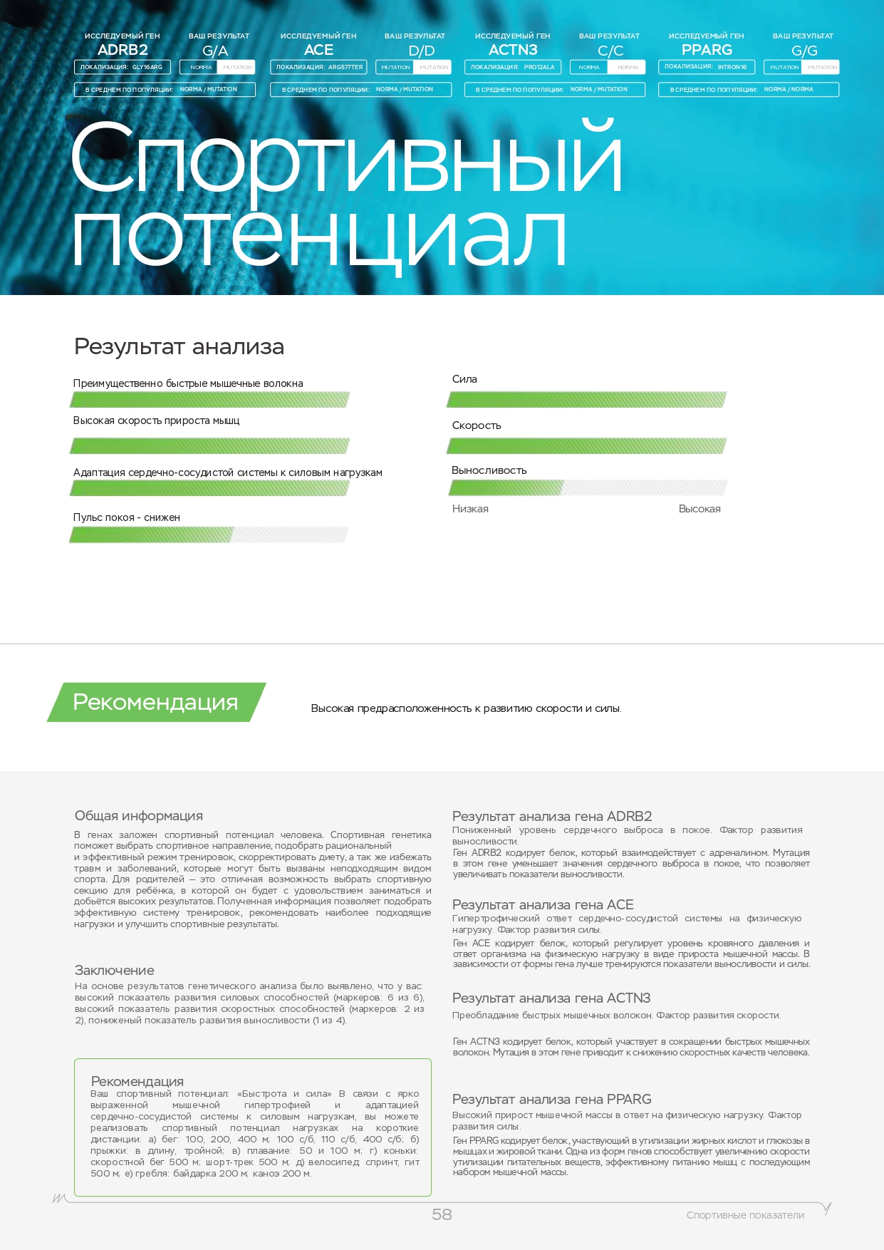 Этот генетический анализ показывает, к каким видам спорта и физическим нагрузкам ребенок предрасположен генетически. Можно заниматься любыми видами спорта, но в определенных видах ребенок достигнет высоких результатов быстрее других детей и с меньшими усилиями. Поэтому мы рекомендуем пройти наш ДНК-тест спорт для ребенка в Волгореченске.